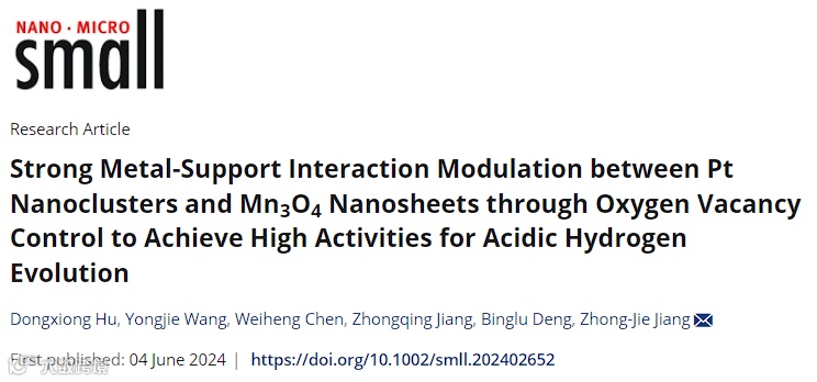 近日,来自华南理工大学的蒋仲杰教授课题组,在国际知名期刊Small上发表题为“Strong Metal-Support Interaction Modulation between Pt Nanoclusters and Mn3O4Nanosheets through Oxygen Vacancy Control to Achieve High Activities for Acidic Hydrogen Evolution”的文章。该文章通过对Mn3O4纳米片氧缺陷的调控,优化了Mn3O4纳米片和Pt纳米簇之间的强金属-支撑体(SMSI)相互作用, 这一方面减少了催化剂中Pt的用量,另一方面提升了Pt纳米簇的催化活性和长效稳定性,所得富含氧缺陷Mn3O4纳米片支撑Pt纳米簇(Pt/V·-Mn3O4 NSs)铂质量活性提升12.4 倍。