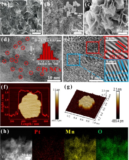 图 1. (a) MnOx NSs, (b) Mn3O4/Mn2O3 复合物, and (c) Pt/V·-Mn3O4NSs的扫描电镜图。Pt/V·-Mn3O4NSs的 (d) 透射电镜图, (e) 高分辨透射电镜图, (f-g) 原子力显微镜图 和 (h) 元素分布图。