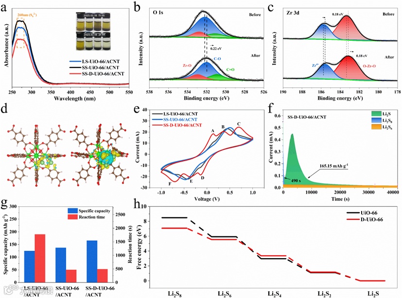 通过调节复合材料中UiO-66的颗粒尺寸大小,缩短锚定在UiO-66上多硫化锂的氧化还原跳跃路径,从而加速了UiO-66内部的电荷传输过程。随后,通过一维碳纳米管桥联多个UiO-66颗粒的交联电子网络结构,从而可以通过碳纳米管收集电荷并进行传输,从而增强整体的电子电荷传输和多硫化锂的氧化还原反应动力学。通过不同颗粒尺寸复合材料对多硫化锂的催化转化实验的结果分析,小尺寸UiO-66的响应时间更短,多硫化锂的反应动力学更具有优势。