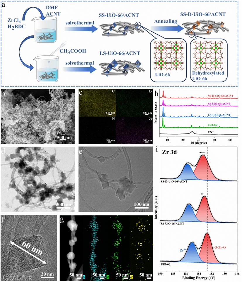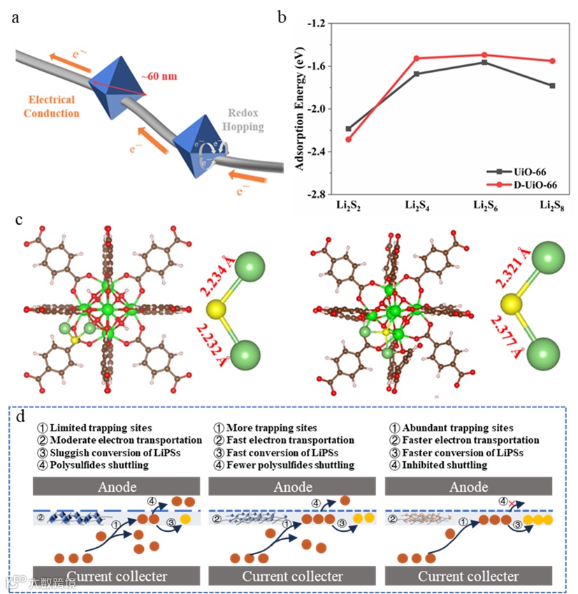 UiO-66的金属有机框架(MOF)复合材料已被广泛应用于多硫化锂(LiPSs)的吸附和催化,但由于其电子导电性较差,因此UiO-66材料通常会与高导电碳材料复合以提升整体的电子导电性和催化转化能力。但是,对于UiO-66/碳材料的结构和电子调控策略的协同工程尚未被广泛研究。