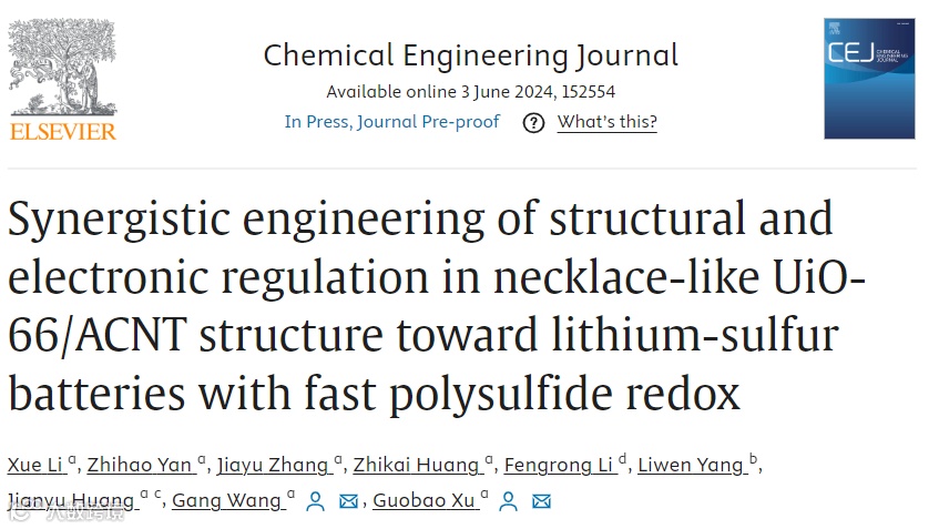 近日,来自湘潭大学的许国保副教授和王钢副教授合作,在国际知名期刊Chemical Engineering Journal上发表题为“Synergistic engineering of structural and electronic regulation in necklace-like UiO-66/ACNT structure toward lithium-sulfur batteries with fast polysulfide redox”的观点文章。