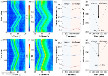 使用In-situ XRD研究了NFPP和SC样品在Na+嵌入/脱出过程中的结构演变。如图3a-b所示,在Na脱出(充电过程)期间,(011)和(104)等主峰逐渐移动到更高的2θ值,在Na嵌入(放电过程)期间恢复到其原始值,这将导致循环过程中连续的晶胞变化。图3e-f中的峰值位移明显小于图3a-b,表明在充放电过程中,SC样品的晶胞参数变化远小于NFPP样品。具体而言,NFPP的晶胞体积在充电过程中变化了4.3%,而SC材料的变化率仅为2.2%。这一发现可能是由于准单晶处理后SC材料在充电过程中晶格变化的各向同性导致。晶格应变没有重叠效应,从而表现出较小的晶格变化。稳定的晶胞有助于材料的循环稳定性。