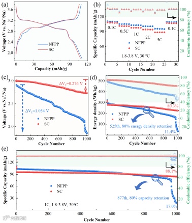图2a显示了NFPP和SC在0.1C、1.8-3.8V之间的充放电曲线。NFPP和SC样品的放电比容量分别为110.2和107.9mAhg−1。两个样品的倍率性能如图2b所示。两种样品的放电比容量随着电流密度的增加而降低。具体而言,在5C的电流密度下,NFPP和SC样品的放电比容量分别降至95.9和88.5mAhg−1。显然,就放电比容量和倍率性能而言,SC样品不如原始的NFPP样品。在1C循环过程中,SC样品的中值电压在所有阶段都高于NFPP(图2c)。在1000次循环后,NFPP和SC的中值电压分别下降了1.054和0.276V。此外,SC样品的能量密度保持率(图2d)和容量保持率(见图2e)分别为80.3%和88.1%,远高于NFPP的值。