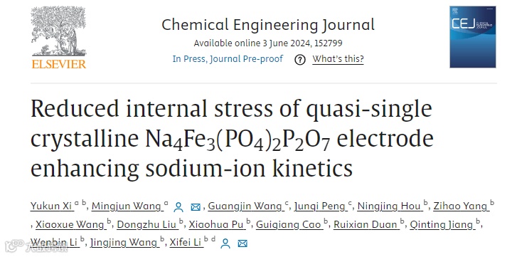 近日,来自西安理工大学的李喜飞教授和王明军教授合作,在国际知名期刊Chemical Engineering Journal上发表题为“Reduced internal stress of quasi-single crystalline Na4Fe3(PO4)2P2O7 electrode enhancing sodium-ion kinetics”的研究文章。该文章首次探讨了单晶化处理在Na4Fe3(PO4)2P2O7 正极材料上的应用,发现能够降低近50%晶格变化,极大的缓解了材料颗粒内应力,从而提升循环稳定性。该文章同时得到四川易纳能新能源科技有限公司王广进经理的大力支持。