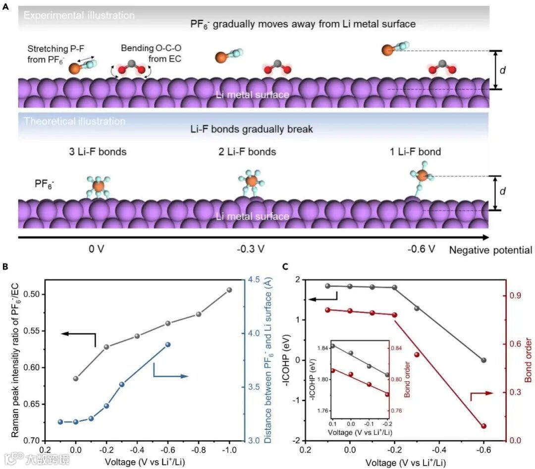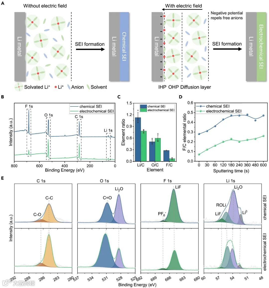 图1要点:化学SEI和电化学SEI的形成过程示意图:在没有电场的情况下,溶剂化的Li+、自由阴离子和溶剂是随机分布的(左图)。当施加电场时,inner Helmholtz plane (IHP)主要由去溶剂化的Li+和溶剂组成,而outer Helmholtz plane (OHP)则被Li+溶剂化结构占据,自由阴离子被排斥在Helmholtz plane之外。XPS分析从不同角度揭示了在1M LiPF6 in EC/DEC电解液中,化学SEI包含了更多的无机组分。