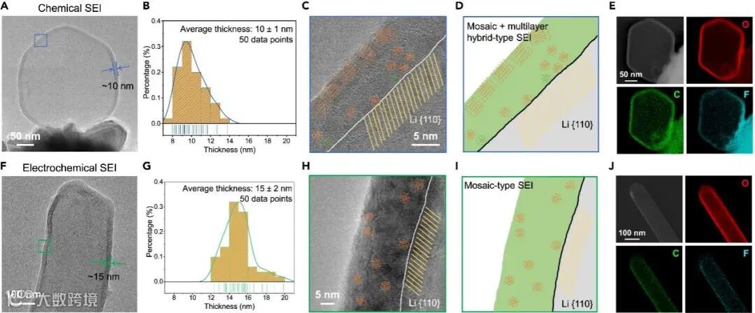 图2要点:通过冷冻电镜对1M LiPF6 in EC/DEC电解液体系中的化学SEI和电化学SEI进行了纳米结构和化学的表征