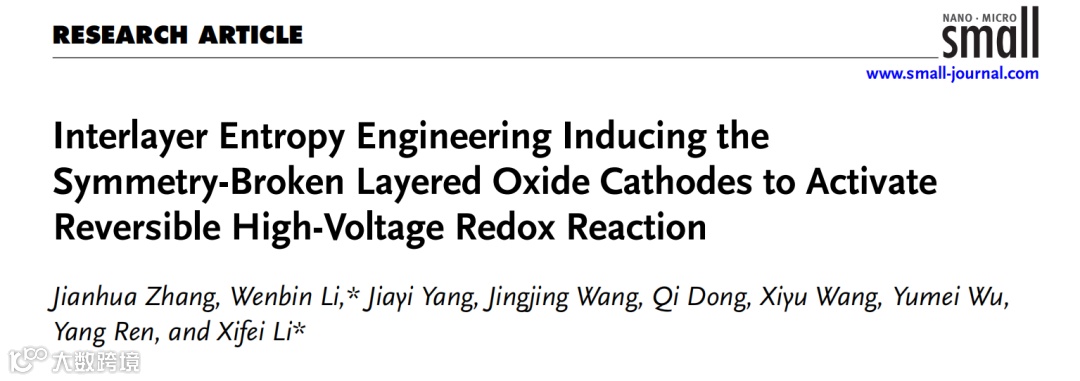 近日,在西安理工大学李喜飞教授课题组在国际知名期刊Small上发表题为“Interlayer Entropy Engineering Inducing the Symmetry-Broken Layered Oxide Cathodes to Activate Reversible High-Voltage Redox Reaction”的研究性论文。该论文通过一步水热法成功构建了一种新型的层间中熵V2O5。五种金属离子共嵌到层间产生的熵效应诱导产生了V2O5中[VO6]八面体的局部对称性破缺,从而激活了高电压氧化还原反应,并且通过钉扎效应抑制了层滑移和相变。结果表明,层间中熵V2O5正极实现了比容量和结构稳定性的同步提升,在100 mA/g的电流密度下经过100次循环后的放电容量为152 mAh/g,在500 mA/g下的电流密度下经过150个循环后的容量保持率为98.7 %。这项工作为高性能层状氧化物正极的合理设计提供了新的指引。