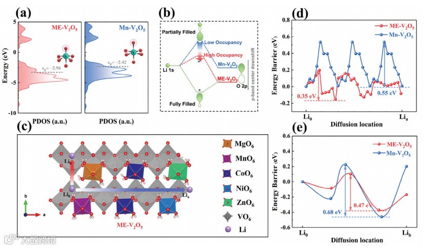 DFT计算发现五种金属离子共嵌使得对称性破缺的[VO6]八面体末端晶格氧的p带中心下移,这增加了Li-O反键轨道占据数,从而削弱了ME-V2O5中末端晶格氧和Li+之间的相互作用,从而提升了双层V2O5晶格中的Li+输运动力学。而且五种金属离子共嵌略微增加了Lia位点的吸附能,这有助于稳定的Li+存储。