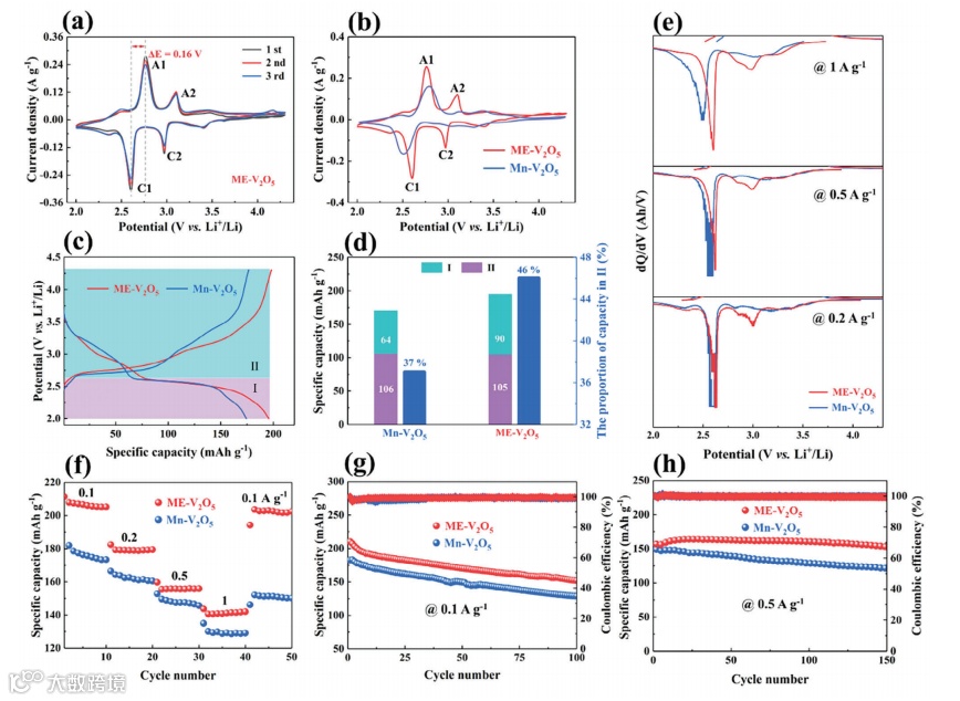 图2:层间中熵V2O5的CV,dQ/dV,GCD,循环和倍率测试。