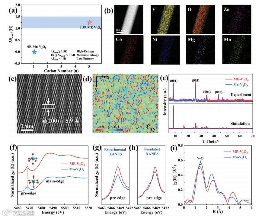 通过一步水热法在双层V2O5的层间共嵌了Mn2+、Co2+、Ni2+、Mg2+和Zn2+(HE-V2O5)。EDS结果表明,Mn、Co、Ni、Mg和Zn被成功预嵌到HE-V2O5的层间。GPA表明多种元素共嵌诱导了强烈的晶格畸变。V的K-edge XANES光谱测试表明同时引入五种金属离子后,HE-V2O5的边前峰强度增加,表明多种元素共嵌导致了[VO6]八面体的局部对称性破缺。