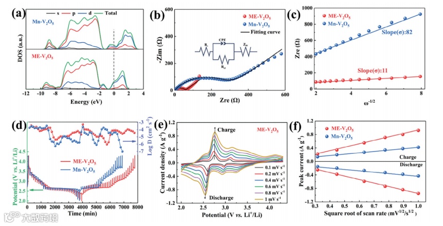 图3:层间中熵V2O5的DOS,EIS,GITT,多扫速CV测试。