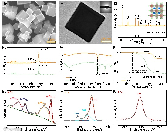相比于传统方法制备的PB(LC-PB),由PAA辅助合成的高结晶度立方相PB(HC-PB)具有更低的晶体水含量。结合电感耦合等离子体测试结果进一步揭示了HC-PB和LC-PB的分子式分别为Na0.96Fe[Fe(CN)6]0.93·0.96H2O和Na0.82Fe[Fe(CN)6]0.79·3.5H2O,表明HC-PB具有更低的缺陷浓度,说明PAA能够通过调控反应介质,显著提升PB的结晶度。