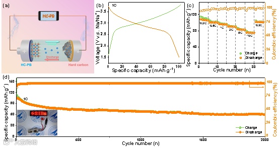 为了验证HC-PB的实际应用潜力,作者组装了基于HC-PB正极和硬碳(HC)负极的钠离子全电池器件。该器件在1.4-3.9 V的电压范围内比容量可达107 mAh g-1,工作电压为2.8 V,同时具有优异的循环性能和倍率性能。