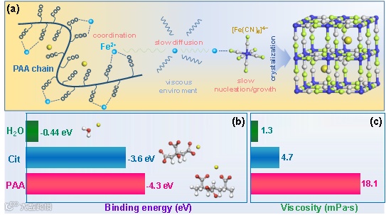 PB的结晶度与形核及生长过程密切相关。然而,先前的研究工作仅仅关注了配位剂对金属离子配位能力的强弱,忽视了离子的扩散能力对晶体的形核及生长过程的影响。为选择更有效的配位剂,作者同时考虑了配位强度与粘度两个因素,遴选出了PAA作为新型配位剂。兼具高配位强度与高粘性的PAA有望在极低用量的前提下辅助合成高结晶度PB。
