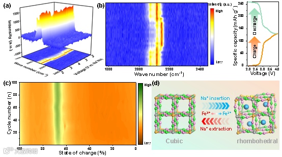为了探寻HC-PB的元素价态及晶体结构在充放电过程中的变化,作者首先通过原位拉曼测试技术对HC-PB在充放电过程中的元素价态变化进行分析。结果表明,HC-PB的铁离子经历了由二价到三价的可逆价态变化。此外,作者结合离位XRD与dV/dQ测试结果揭示了晶体在充放电过程中的立方-菱方可逆两相相变。元素价态与晶型的可逆变化保证了HC-PB的循环稳定性。