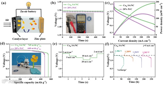 图5. 以CoH SA/NC和Pt/C为空气阴极的锌-空气电池测试