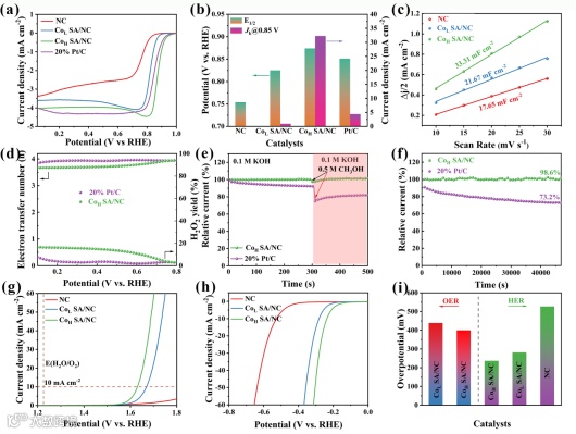 图3. NC,CoL SA/NC和CoH SA/NC的ORR,OER和HER测试
