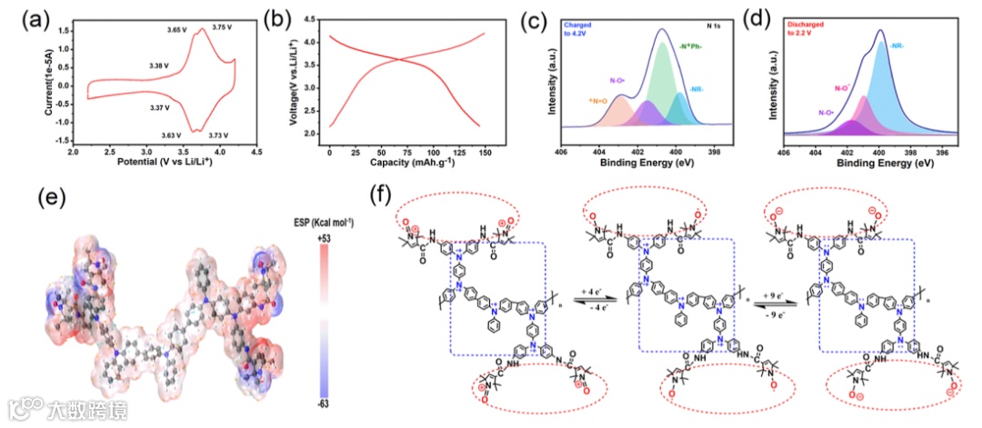图4. P(DATPAPO-TPA)的电化学性能表征:(a) P(DATPAPO-TPA)电极在0.1 mV/s扫描速率下的循环伏安(CV)曲线。(b) P(DATPAPO-TPA)正极在2.2至4.2 V之间以50 mA/g电流密度的初始充放电曲线。(c,d) 全充电(c)和全放电(d)状态下的XPS核心能级N 1s光谱。(e) P(DATPAPO-TPA)重复单元的电位曲线和分子静电势(MESP)图。(f) P(DATPAPO-TPA)正极在充放电过程中可能的电子传输机制示意图。