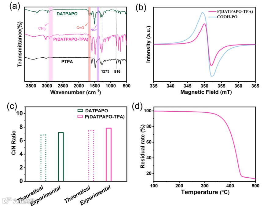 图3. P(DATPAPO-TPA)的化学表征:(a) DATPAPO、P(DATPAPO-TPA)和PTPA的红外光谱。(b) P(DATPAPO-TPA)的电子顺磁共振(EPR)光谱。(c) DATPAPO和P(DATPAPO-TPA)样品的元素分析结果及其对应的理论值。(d) P(DATPAPO-TPA)的热重分析(TGA)。