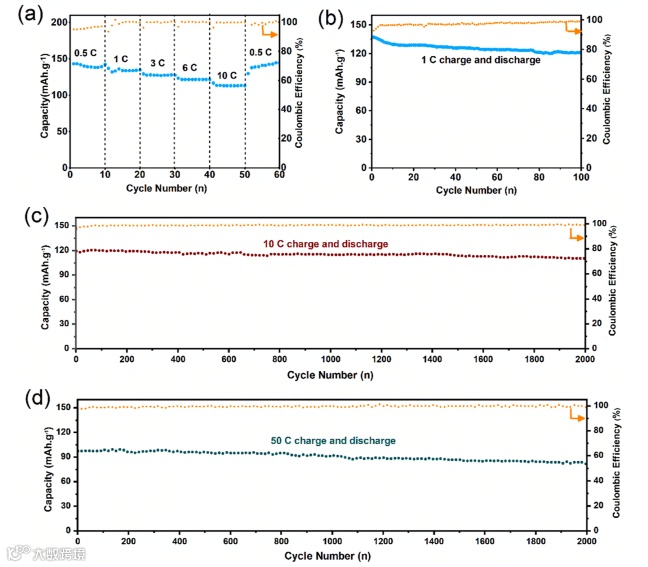 图5. P(DATPAPO-TPA)在1 M LiPF₆/EC-DMC-EMC(体积比1:1:1)电解质中的电化学性能(电压范围2.2至4.2 V,适用于锂电池):(a) 在0.5至10 C的不同电流密度下的倍率性能和库仑效率。(b) 在1 C倍率下的循环性能。(c) 在10 C倍率下的循环性能。(d) 在50 C倍率下的循环性能。