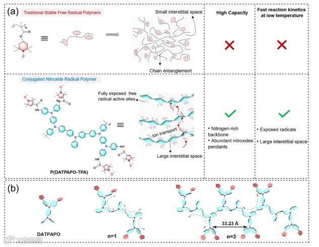 图1. (a) 本研究中稳定的NRP(氮氧自由基聚合物)的设计策略。(b) DATPAPO和P(DATPAPO-TPA)的空间结构示意图,不同的结构单元:随着聚合度的增加,空间扭曲的苯环在聚合物链段中形成了最大33 Å的松散间隙,有利于离子传输。
