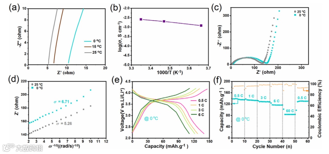 图6. (a) 电解质膜在不同温度条件下的Nyquist图。(b) 从Nyquist图中得到的电解质膜在不同温度下的离子电导率。P(DATPAPO-TPA)正极在0℃下的动力学分析:(c) P(DATPAPO-TPA)正极不同温度下的Nyquist图。(d) 低频频范围内Z′与ω⁻¹/²的关系。P(DATPAPO-TPA)正极在0℃下的电化学性能表征:(e) P(DATPAPO-TPA)正极在0℃下0.5、1、3和6 C倍率的充放电曲线。(f) P(DATPAPO-TPA)正极在0℃下的倍率性能和库仑效率。