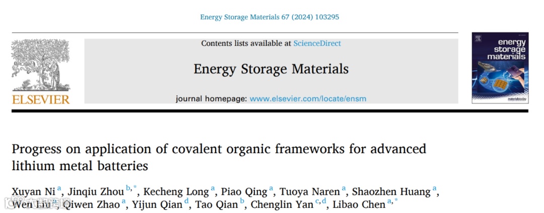 近日,来自中南大学的陈立宝教授与南通大学的周金秋教授合作,在国际知名期刊Energy Storage Materials上发表题为“Progress on application of covalent organic frameworks for advanced lithium metal batteries”的观点文章。该观点文章汇总了近期共价有机框架材料在锂金属电池各个组件(正极、负极、隔膜、电解质)中的应用的进展,同时分析了此类应用中的工作原理和改善电化学性能的策略。