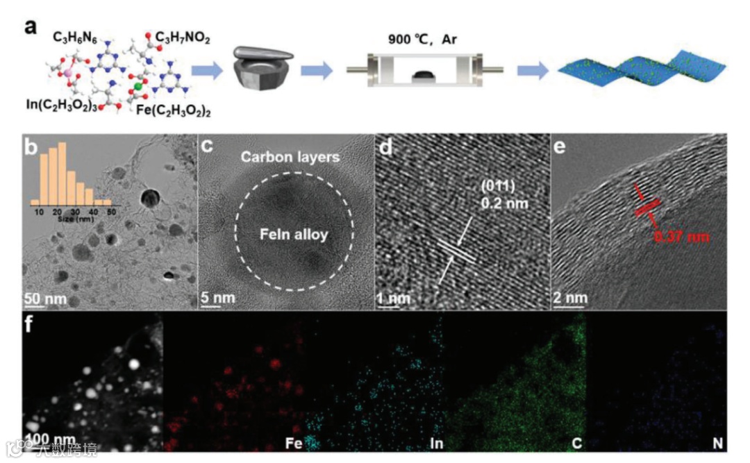 TEM表明合成出具有层状结构的FeIn-NC,其中直径约为20 nm的Fe-In合金纳米颗粒被封装在碳层中。