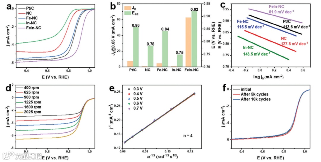 FeIn-NC表现出良好的氧还原活性,半波电位、动力学电流密度与塔菲尔斜率均优于商用Pt/C。K–L方程推导出电子转移数为4,ORR过程主要为4 e-途径。并且在10,000次循环下半波电位几乎保持恒定,表现出优异的稳定性。