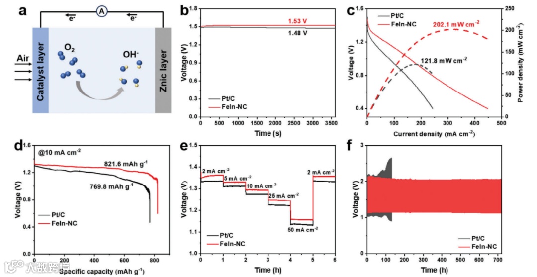 基于FeIn-NC组装的锌空电池性能优异,其功率密度、比容量与倍率性能均优于Pt/C,且在720 h的循环充放电测试中表现出良好的稳定性。