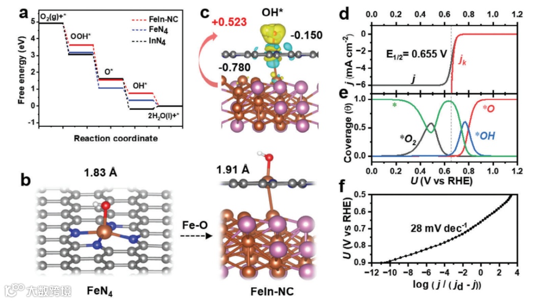 DFT计算表明Fe-In合金与FeN4单原子的协同作用改变了FeN4位点的电子结构和电荷转移,调节ORR中间体的吸附和解吸,从而提高电催化ORR反应的催化活性。MKM分析与实验结果一致,进一步揭示了ORR反应机制。