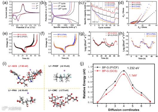 图2.(a)BP-G (GCS)半电池在0.2 mV s-1扫描速率下的CV曲线。(b)BP-G (GCS)半电池在0.1 A g-1条件下不同循环的电压曲线。(c)不同电极的倍率性能。(d)200圈循环后半电池的奈奎斯特图。(e)BP-G (GCS)、BP-G (PVDF)、(f)BP-G (PAA)和BP-G (CMC)的GITT曲线。(g)BP-G (GCS)、BP-G (PVDF)、(h)BP-G (PAA)和BP-G (CMC)的Li+扩散系数(DLi+)计算结果。(i)Li+与GCS、PVDF、PAA和CMC粘结剂的模拟结合能。(j)BP-G (GCS)和BP-G (PVDF)的模拟扩散阻力。