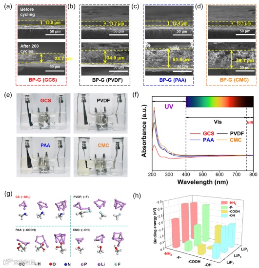 图4.(a)BP-G (GCS)、(b)BP-G (PVDF)、(c)BP-G (PAA)和(d)BP-G (CMC)在1 A g-1下循环200次前后的横截面FESEM图像。(e)四种不同粘结剂的BP-G电极在1 A g-1下循环20次后在H型电池光学图像,以及(f)其液体电解质的紫外光谱。(g)LixPs与官能团(-NH2、-F、-COOH和-OH)之间的吸附结构。(h)不同粘结剂中LixPs与官能团之间的结合能。