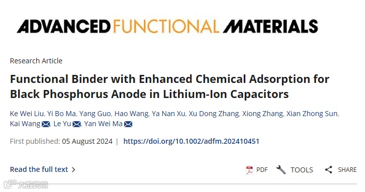 Ke Wei Liu, Yibo Ma, Yang Guo, Hao Wang, Yanan Xu, Xudong Zhang, Xiong Zhang, Xianzhong Sun, Kai Wang*, Le Yu* and Yanwei Ma*, Functional Binder with Enhanced Chemical Adsorption for Black Phosphorus Anode in Lithium-Ion Capacitors. Adv. Funct. Mater. 2024, DOI: 10.1002/adfm.202410451