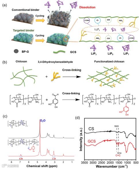 图1.(a)分别使用传统粘结剂和GCS粘结剂基于BP-G的电极示意图。(b)GCS粘结剂的合成示意图。(c)CS(上)和GCS(下)的1H NMR光谱。(d)CS和GCS的傅立叶变换红外光谱。