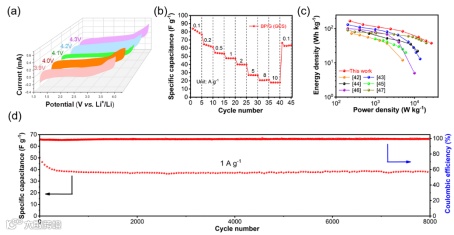 图5. BP-G (GCS)//AC的(a)CV曲线、(b)倍率曲线、(c)Ragone图和(d)长循环测试。