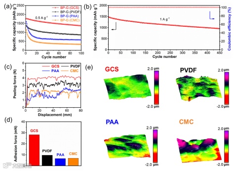 图3.(a)BP-G (GCS)、BP-G (PVDF)、BP-G (PAA)和BP-G (CMC)半电池在0.5 A g-1下的循环性能。(b)1 A g-1时BP-G (GCS)的循环性能。(c)使用GCS、PVDF、PAA和CMC的BP-G负极的剥离测试、附着力测试和表面粗糙度。
