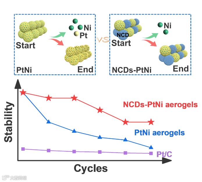 图1. NCDs-PtNi和PtNi气凝胶催化过程中的结构变化示意及性能对比图
