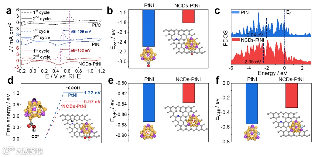 NCDs的引入改善了PtNi催化剂活性中心的抗*CO毒化性能、降低了Pt的d带中心和催化关键步骤的反应能垒、提高了Pt和Ni原子脱离催化剂表面的所需的空位形成能量,从而使其具有较好的结构稳定性和催化稳定性。