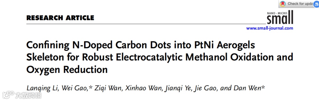 近日,西北工业大学的文丹、高唯团队发表了题为“Confining N-Doped Carbon Dots into PtNi Aerogels Skeleton for Robust Electrocatalytic Methanol Oxidation and Oxygen Reduction”的研究论文,该文章从构筑碳点(NCDs)与金属复合的气凝胶骨架出发,以降低催化过程中结构的坍塌和团聚、提高金属气凝胶的稳定性并保持高活性为目标,发展了一种新颖的复合气凝胶(NCDs-PtNi)的制备策略,最终显著提高了酸性条件下PtNi气凝胶电催化MOR和ORR的稳定性,并揭示了气凝胶电催化性能提升机制。