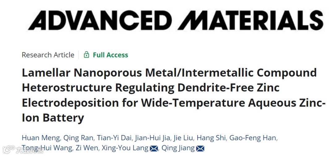 近日,来自吉林大学的郎兴友教授与蒋青教授在国际知名期刊Advanced Materials上发表题为“Lamellar Nanoporous Metal/Intermetallic Compound Heterostructure Regulating Dendrite-Free Zinc Electrodeposition for Wide-Temperature Aqueous Zinc-Ion Battery”的研究文章。该研究文章设计了一种具有层片状纳米多孔结构的Cu/Al2Cu金属/金属间化合物异质结构材料作为水系锌离子电池的无锌负极,在对其电化学性能进行研究的基础上阐明了异质结构电极对Zn2+剥离/电镀行的调控的内在机理,为进一步开发高性能水系锌离子电池负极提供了新的思路。