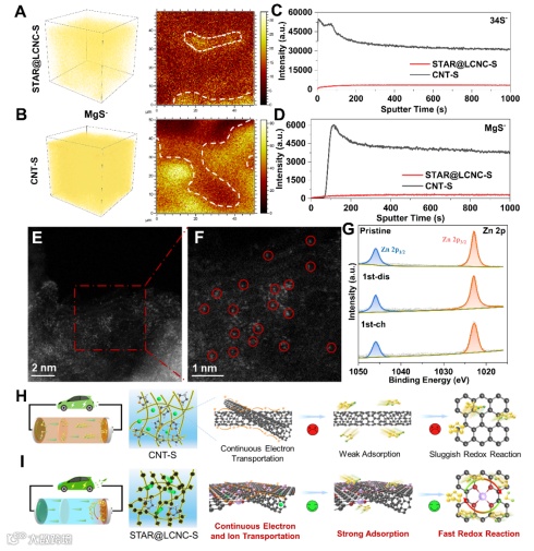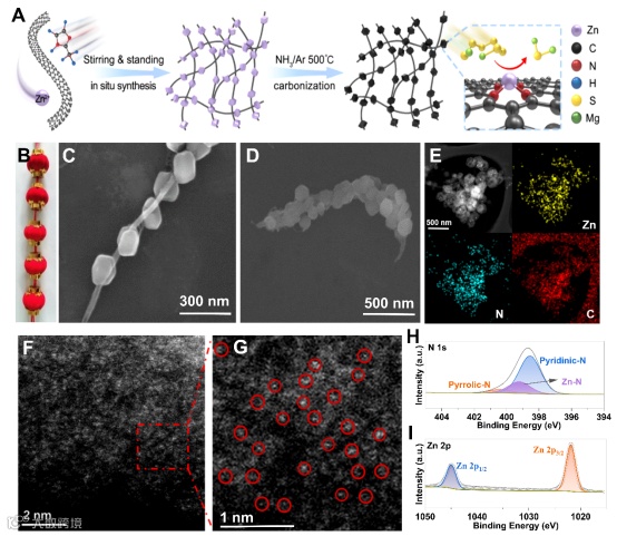 扫描电镜(SEM)显示材料呈现明显的串状结构。高分辨率高角度环形暗场扫描透射电镜(HAADF-STEM)显示没有明显的Zn聚集(团簇或颗粒)存在,可以清楚地观察到孤立Zn原子。STAR@LCNC显示出更大的表面积和更丰富的多孔结构,这有利于筛选溶剂化的Mg2+和吸附多硫化物。同时,利用X射线光电子能谱(XPS)证明了STAR@LCNC中形成了Zn-N键来锚定Zn原子催化剂。