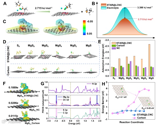 在STAR@LCNC上MgCl2(THF)2的脱溶过程比在氮掺杂碳(NC)上的脱溶过程具有更低的电负性,说明STAR@LCNC与MgCl2(THF)2的相互作用更弱,更有利于解离形成自由的Mg2+。硫及硫化物在STAR@LCNC表面的吸附能最高,具有亲硫效应。锌原子催化剂引入后,Zn 3d与S 2p、N 2p和Mg 2p形成明显的杂化,表明STAR与多硫化物之间存在化学相互作用。导价带间隙呈减小趋势,表明STAR@LCNC中电子传导能力增强。MgS的分解势垒大幅降低,证明了STAR@LCNC在加速MgS转化和提高硫利用率方面的具有优越的催化效果。
