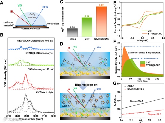 构建了原位界面和频光谱(SFG),监测在施加/不偏置电压下溶剂化的Mg2+的脱溶行为,揭示了催化剂能加速MgCl(THF)x+结构的解离,并在界面处释放大量游离Mg2+,表明STAR@LCNC促进Mg2+-溶剂解离并显著改善离子扩散和输运动力学。为了进一步研究STAR@LCNC异质结构的电催化活性,进行了多硫化物吸附、多硫化物转化和MgS沉积实验,从对称电池和全电池的循环伏安分析其氧化还原可逆性及其催化活性,表明STAR@LCNC在电池中可以加速离子传输,更多的多硫化物被转化。