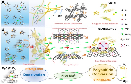 针对镁硫电池中的离子去溶剂化及多硫化物转化缓慢的问题,中国科学院苏州纳米所蔺洪振研究员联合德国卡尔斯鲁厄理工学院王健博士及湖南大学王双印教授,在国际知名期刊Energy & Environmental Science上发表题为“Self-Tandem Catalysis of Fast Mg2+ Desolvation and Sulfur Conversions for Ultrahigh-Performance Mg-S Battery via Serially-Assembled Atomic Reactors”的文章。该工作首创了自串联催化实现Mg2+快速脱溶和多硫转化的方法,并构筑了长程导电串状结构氮掺杂纳米碳负载锌原子催化剂(STAR@LCNC),用于实现快速的界面Mg2+脱溶动力学,以改善随后的硫氧化还原转化动力学。通过理论模拟、静态多硫化物吸附、电化学分析、原位光谱和电化学表征,全面论证了STAR@LCNC在调整溶剂化结构、加速Mg2+传导和降低势垒催化多硫化物转化反应中的重要催化作用和工作机理。