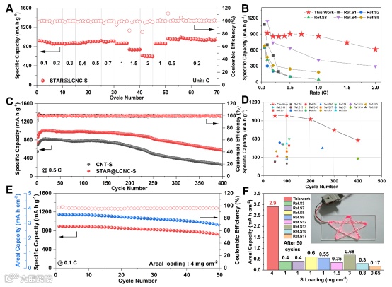 STAR@LCNC的催化作用在倍率和循环性能上也得到了验证。经过400次循环后,STAR@LCNC-S电池的容量稳定在约577 mA h g-1,并且具有较低的过电位,结果明显优于现有成果。此外,将面载量提高到4 mg cm-2,电池可以为LED灯供电,并在0.1 C下显示出964 mA h g-1的初始容量。经过50次循环后,高面载正极仍然显示出2.92 mA h cm-2的面容量,容量保持率为75.6%。这些结果有力地证明了STAR促进了MgCl(THF)x+的解离、Mg2+和多硫化物转化动力学,从而提高了倍率性能并延长了电池寿命。
