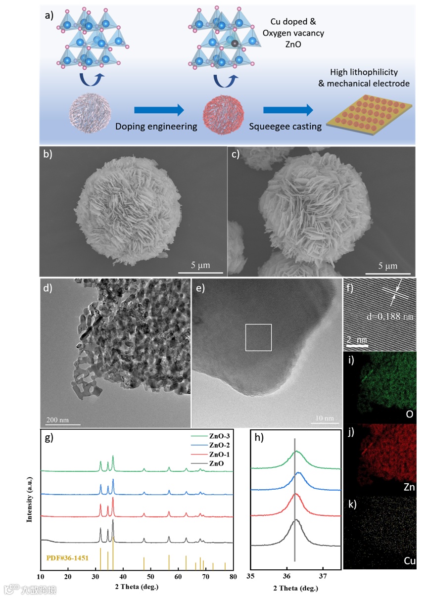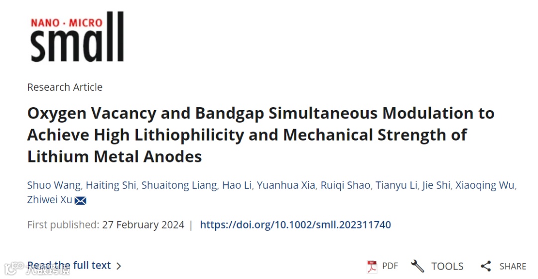 近日,来自天津工业大学徐志伟教授在国际知名期刊Small上发表题为“Oxygen Vacancy and Bandgap Simultaneous Modulation to Achieve High Lithiophilicity and Mechanical Strength of Lithium Metal Anodes”的文章。该文章对氧化锌的带隙和氧空位进行同时调控,最终得到了具有低带隙、富氧空位和高机械强度的氧化锌微米球并用作金属锂负极。这项工作为锂金属电池的实际应用提供了重要启示。