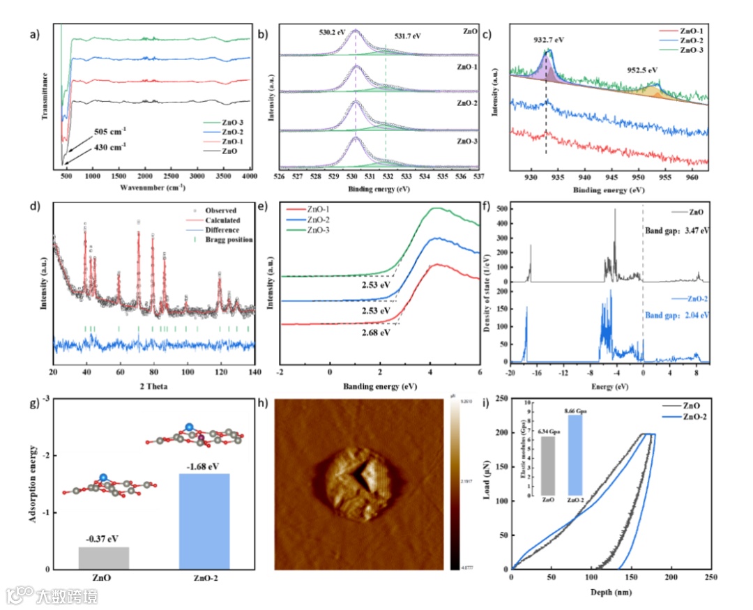 通过红外光谱,X射线光电子能谱,价带谱,第一性原理计算分别证明了氧空位的增加和带隙的减少。通过纳米压痕证明了所制备的掺杂氧化锌有明显的力学提升。