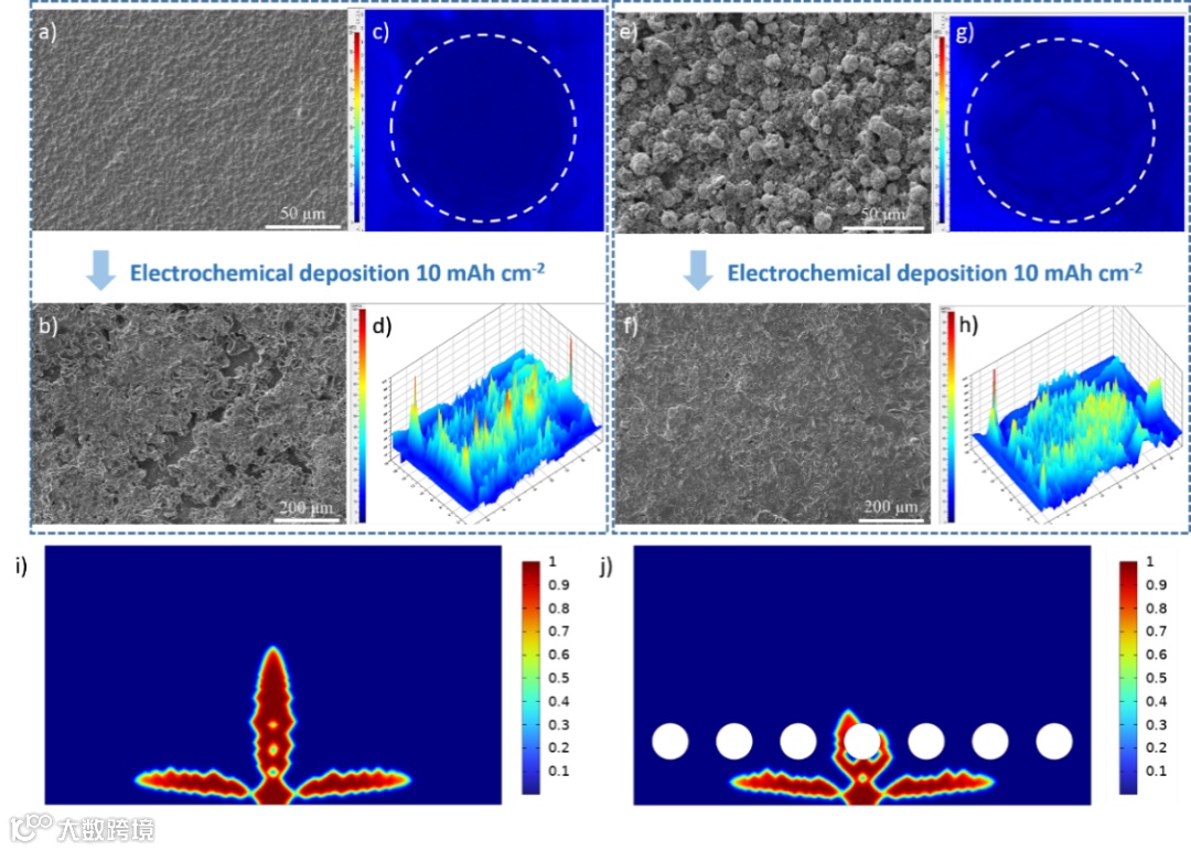通过超声C扫描发现铜箔电化学沉积前几乎没有可见缺陷,而沉积后,出现了可见缺陷,甚至有些缺陷出现了高强度的红色像素。对于氧化锌复合电极,虽然电化学沉积前电极中由于颗粒堆积存在少量缺陷,但与铜箔相比,沉积后锂分布更均匀,缺陷更少。通过相场模拟可以发现,由于球型结构的引入,垂直于电极方向的枝晶受到抑制。