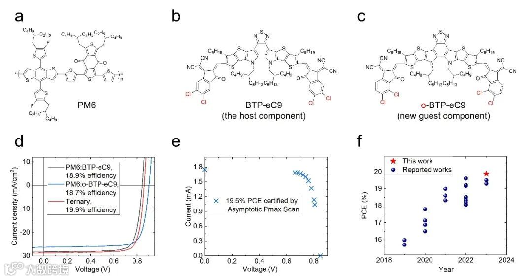 近日,香港理工大学李刚教授与台州学院陆仕荣研究员及中国科学院重庆绿色智能技术研究院肖泽云研究员 团队 合作,在Nature Communications上发表题为“Rational molecular and device design enables organic solar cells approaching 20% efficiency”的研究文章。该工作系统性地研究了第三组分的设计规则。作者们从受体分子的端基卤代位置出发,结合理论计算,设计合成了一个新的非富勒烯受体o-BTP-eC9。得益于电荷转移态的提升,o-BTP-eC9显著提升光伏器件光电压,降低了有机太阳能电池的能量损失。此外,新的受体与宿主受体BTP-eC9具有优异的混溶性、结晶和能级兼容性,使得基于PM6:BTP-eC9:o-BTP-eC9的三元体系的效率达到了19.9% (认证效率为19.5%),刷新了单节有机太阳能电池的效率记录。